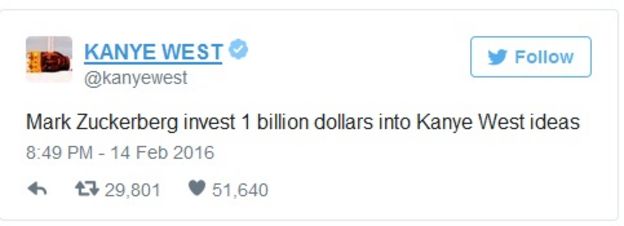 Jambo la kushangaza ni kwamba Kanye West amemuomba Zuckerberg usaidizi kupitia Twitter ambao ni mtandao unaoshindana na Facebook.
